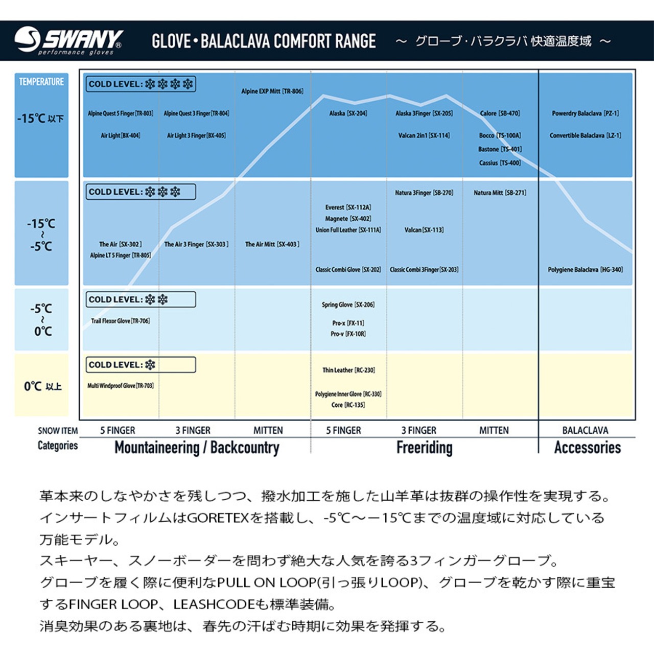 フリーライディング向けに作られたValcanは、手を包み込むスワニー独自のカッティングで抜群のホールド感とフィット感を生み出す。