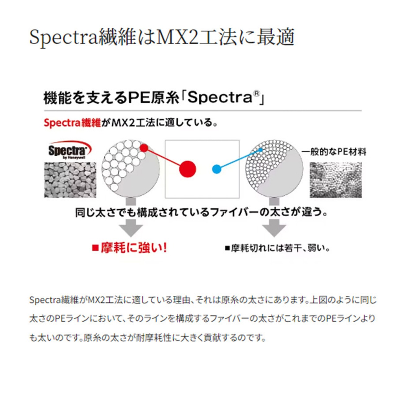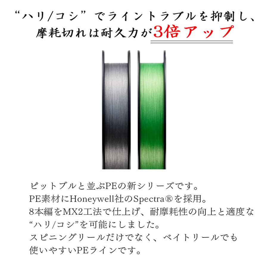 ピットブルと並ぶPEの新シリーズです。PE素材にHoneywell社のSpectra®を採用。8本編をMX2工法で仕上げ、耐摩耗性の向上と適度な“ハリ/コシ”を可能にしました。スピニングリールだけでなく、ベイトリールでも使いやすいPEラインです。